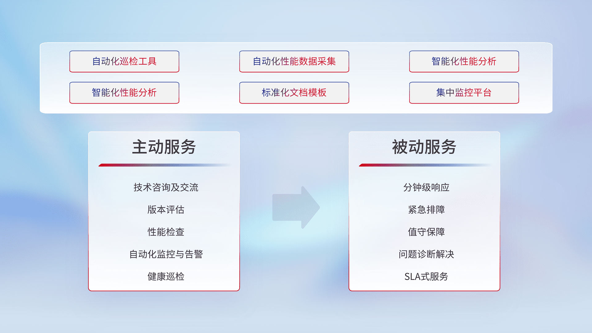 智能化工具和标准化文档,,,,保障服务质量,,提供主动服务(包含技术咨询、、、版本评估、、、、性能检查、、、自动化监控与告警、、、、健康巡检)和被动服务包含(分钟级响应、、、、紧急排障、、、、值守保障、、问题诊断解决、、SLA服务)。。。