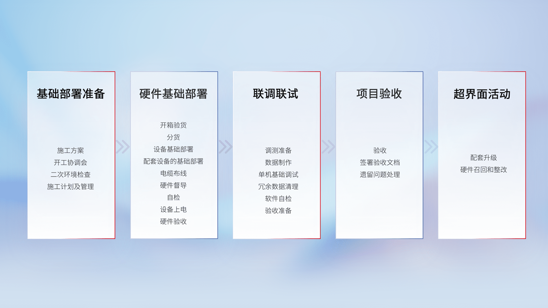 从基础部署准备、、硬件基础部署、、、联调联试、、、项目验收、、、、越界面活动的全过程可追溯,,保证施工质量和进度。。
